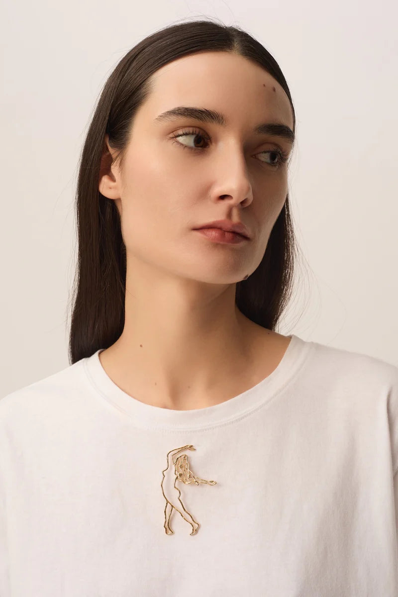 A trendy accessory to treat yourself to without hesitation, the Matisse wire brooch is both chic and poetic. Depicting the silhouette of a woman dancing, her hair adorned with charms, let yourself be seduced by this little gem of a garment. 4.8 x 7.3 cm