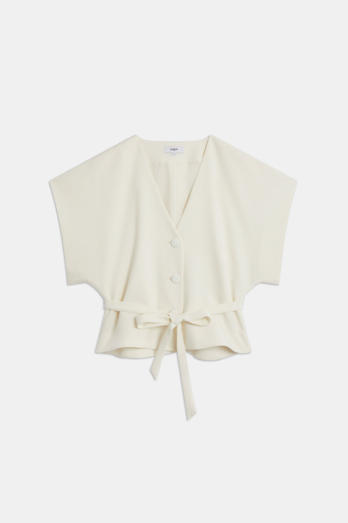 Un chemisier raffiné à col en V, à la silhouette légèrement structurée et au drapé élégant. Doté de larges manches courtes sculpturales et d'un devant épuré orné de boutons décoratifs, il est cintré à la taille par une ceinture à nouer pour créer un effet péplum flatteur. À la fois chic et féminin, il se marie sans effort avec un pantalon tailleur pour une allure moderne et sophistiquée.