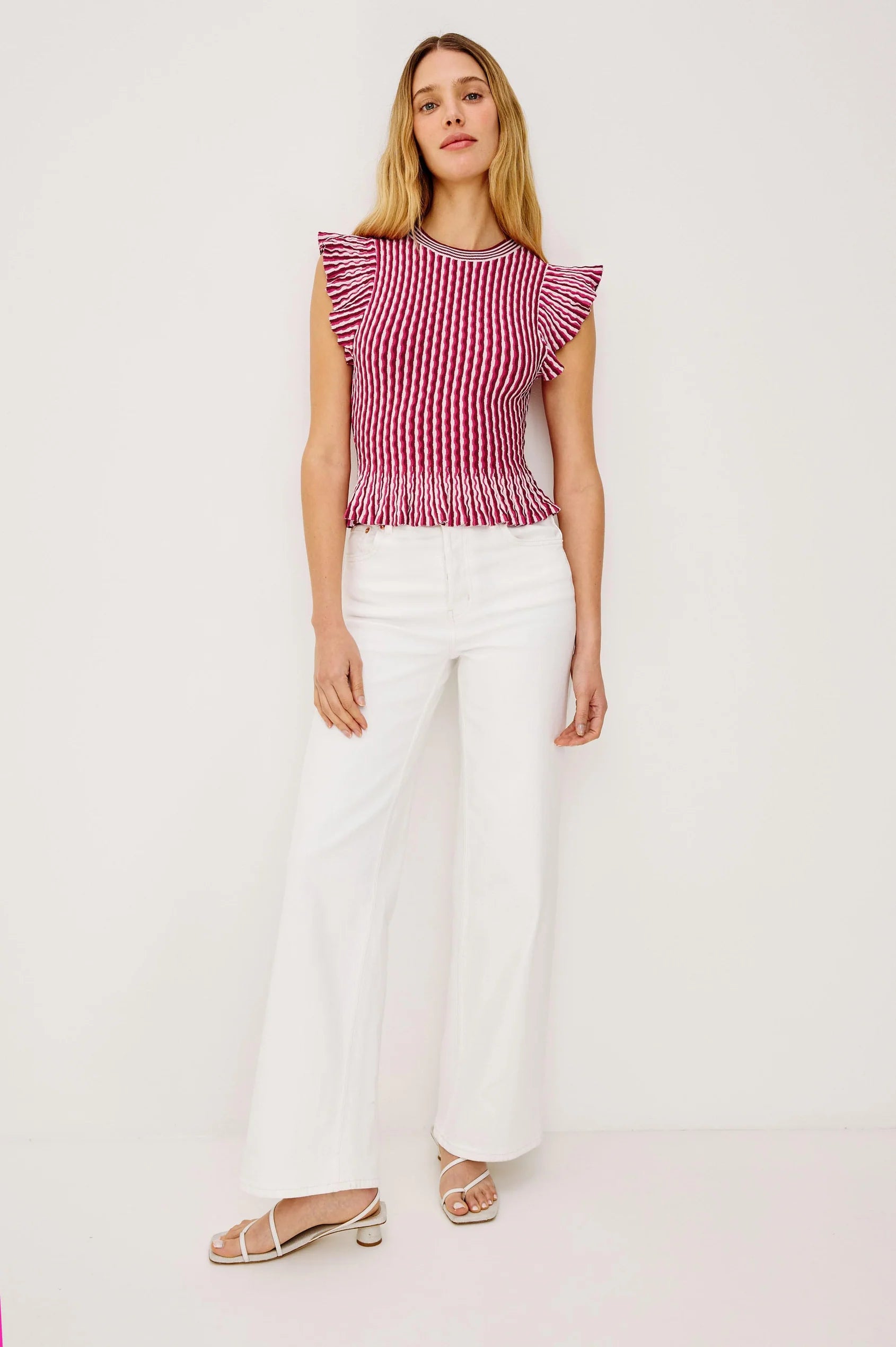Impact made effortless, the Bryn is a fitted top in a compact stretch knit featuring flutter cap sleeves, a ribbed crew neckline, and a flattering peplum hem.Content: 84% Viscose | 16% Pbt