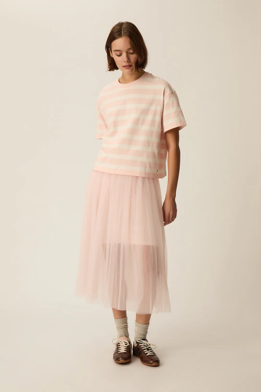The Filma striped tee is a modern essential with an effortlessly cool feel. Designed in a slightly boxy, oversized fit, it pairs perfectly with high-waisted trousers, relaxed denim, or tailored shorts for an easy spring-summer silhouette. A versatile everyday staple that brings a fresh touch to both casual and polished looks.