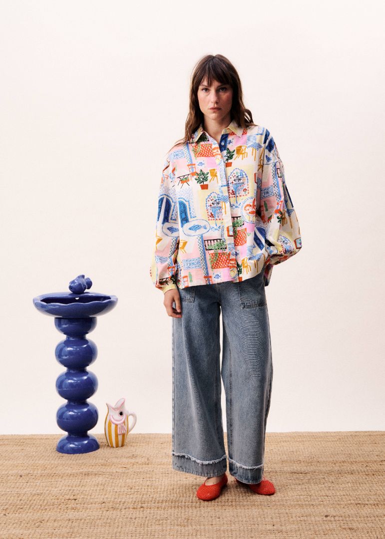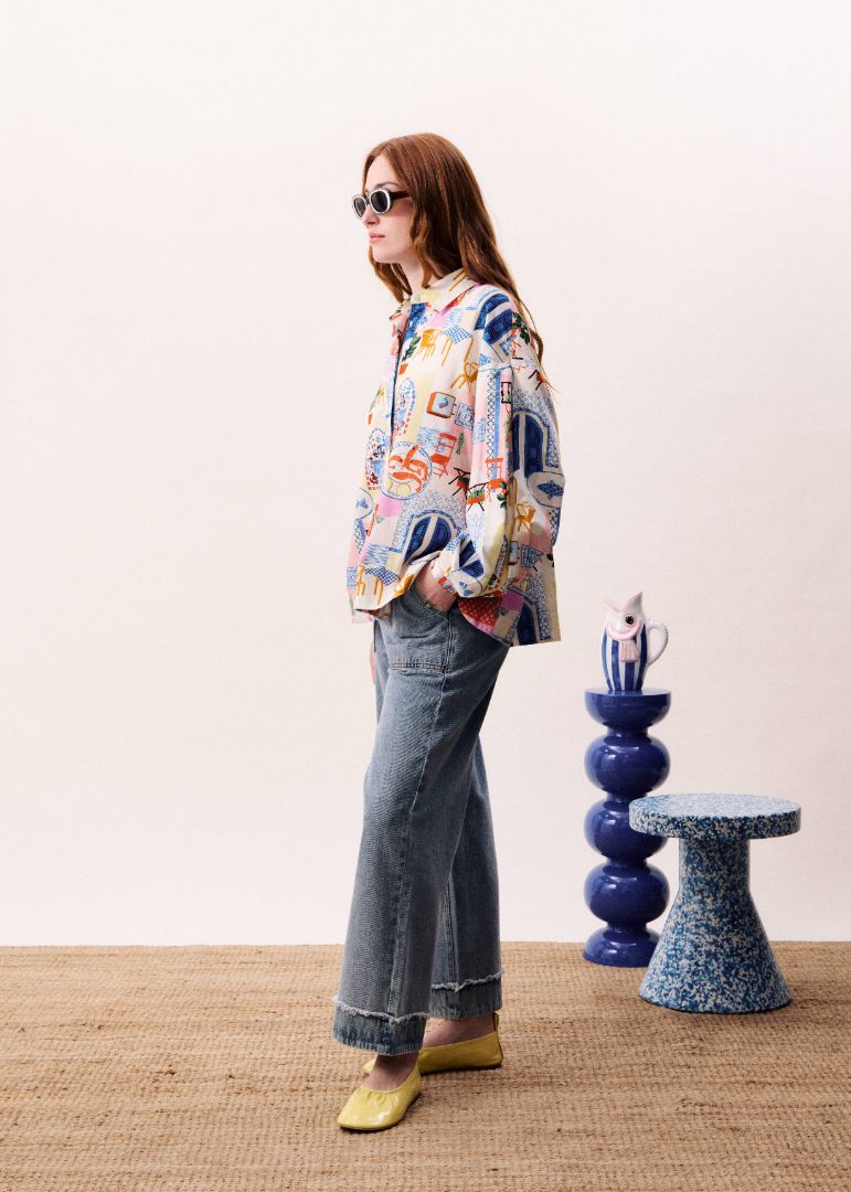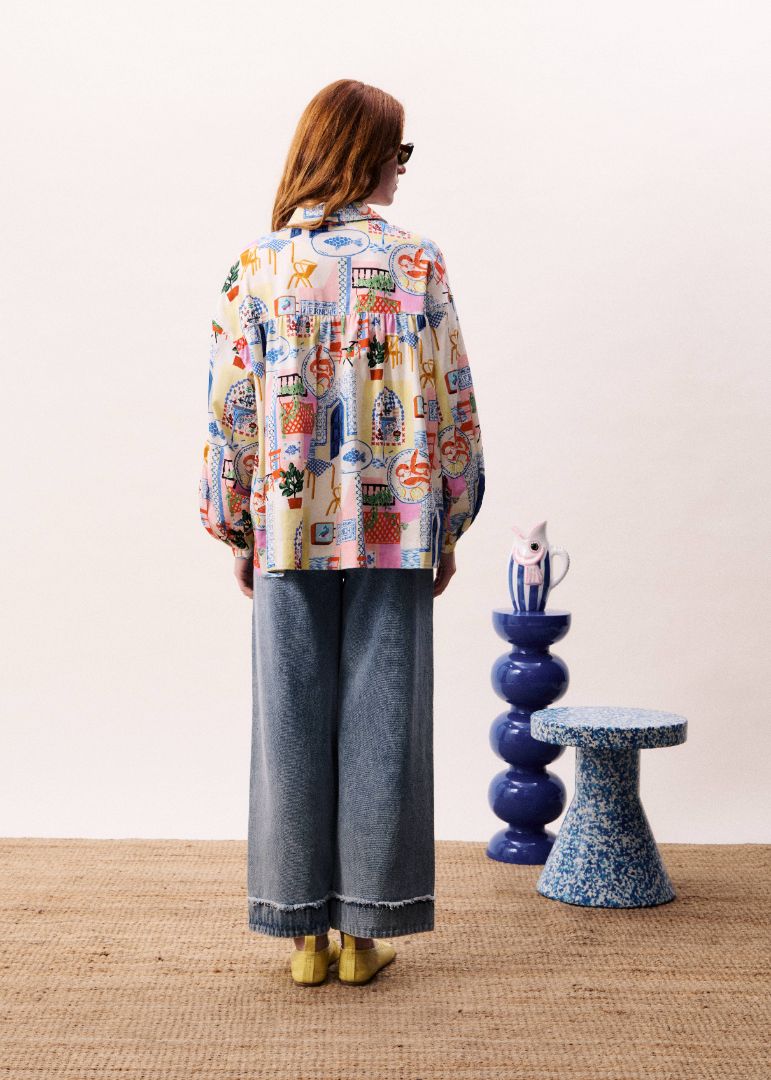 This statement shirt features a playful patchwork-inspired print blending graphic illustrations and decorative elements. Designed in a relaxed silhouette, it offers a softly structured collar, long sleeves with gentle volume, and a fluid drape that moves effortlessly. Easy to style tucked into denim or paired with the matching shorts, it brings character and charm to everyday looks.