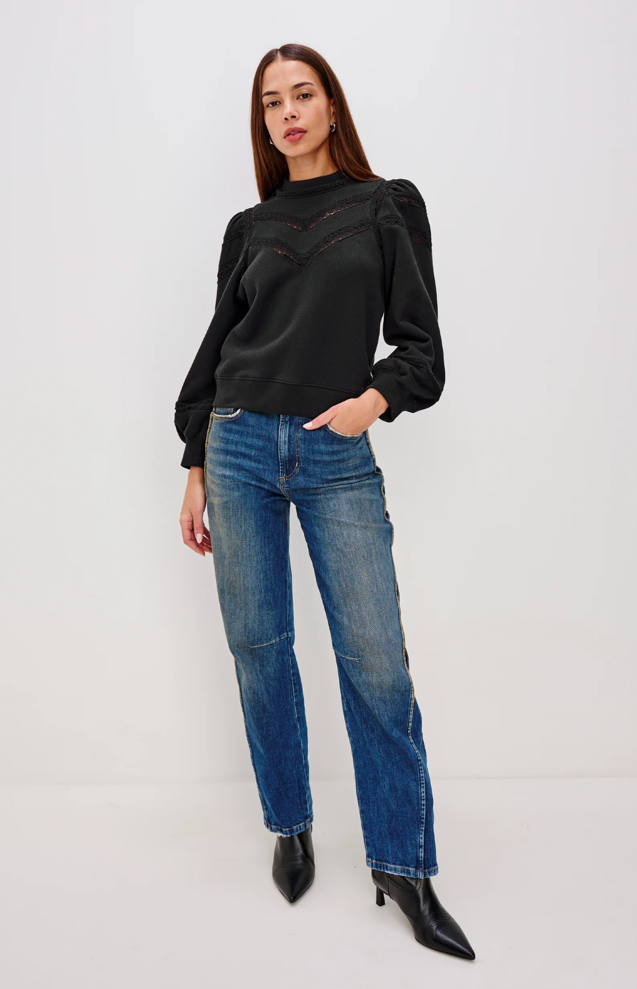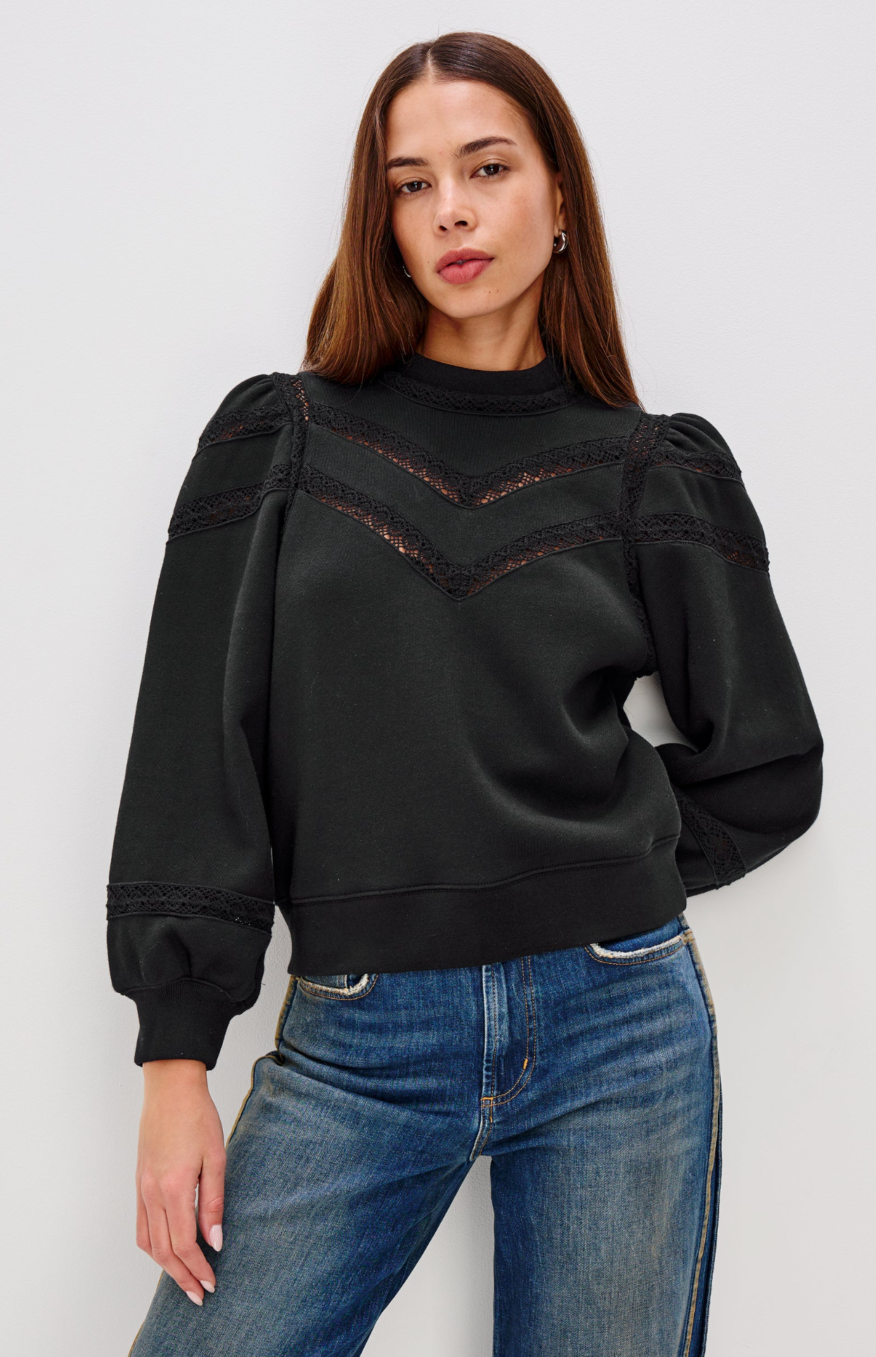 The classic sweatshirt, made super feminine. The Isles is a relaxed, slightly cropped sweatshirt with a timeless mockneck, sheer embroidered detailing, long puff sleeves, and ribbed trim.