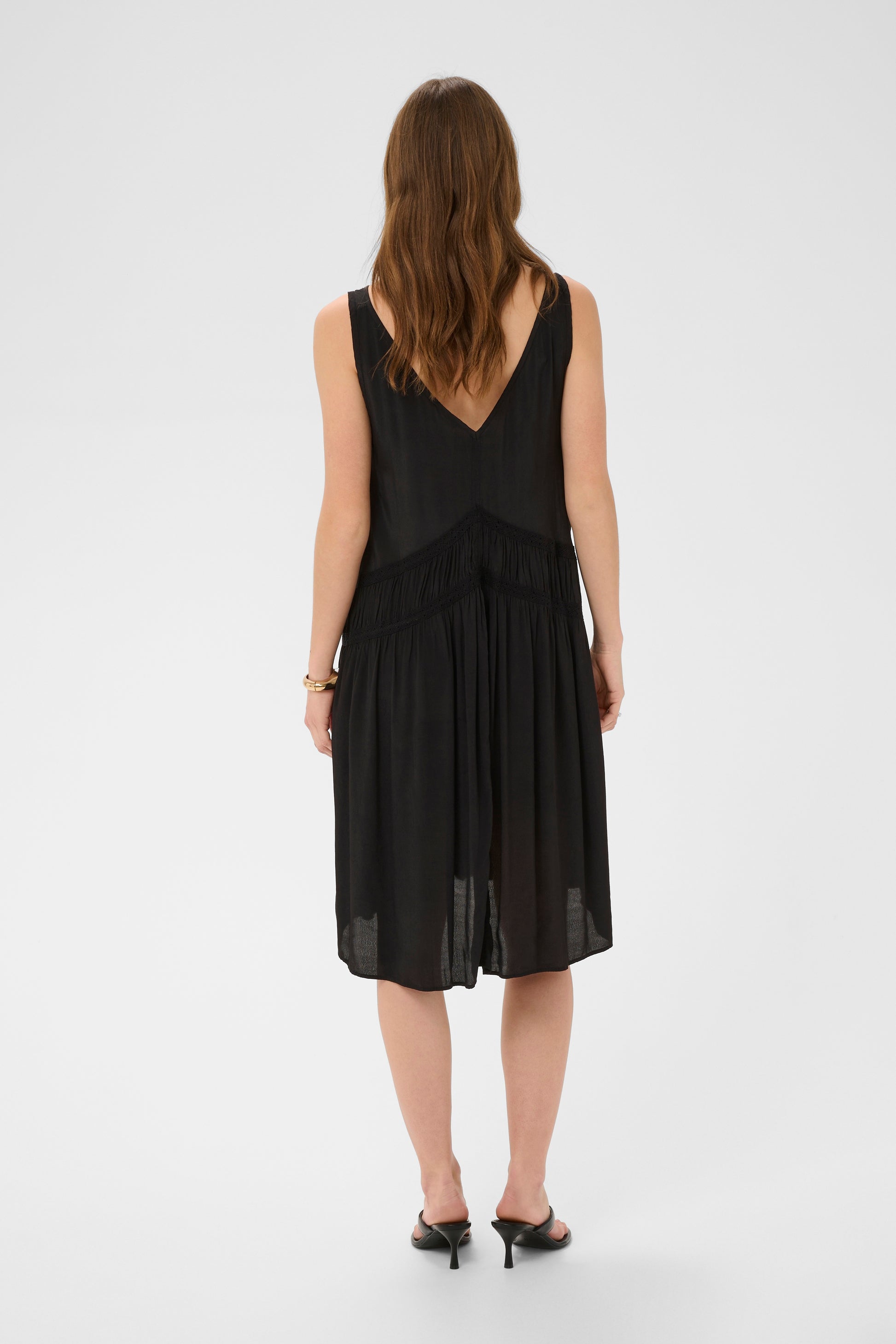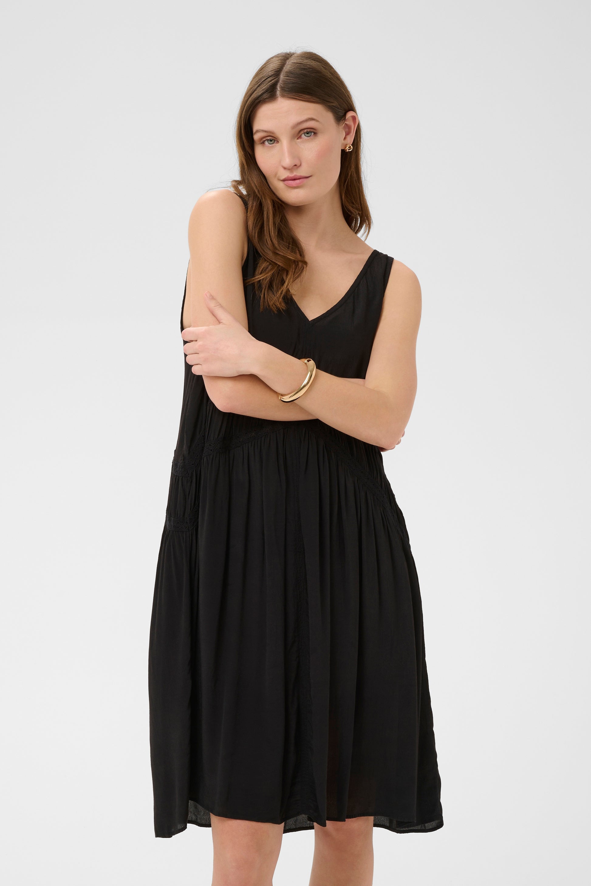 Effortlessly feminine sleeveless dress crafted in a soft, lightweight fabric with a fluid drape. Designed with a flattering V-neckline and relaxed, flowy silhouette, it features delicate lace trim and gathered detailing that add subtle texture and movement. An easy, versatile piece perfect for warm days or layering with tailored staples.