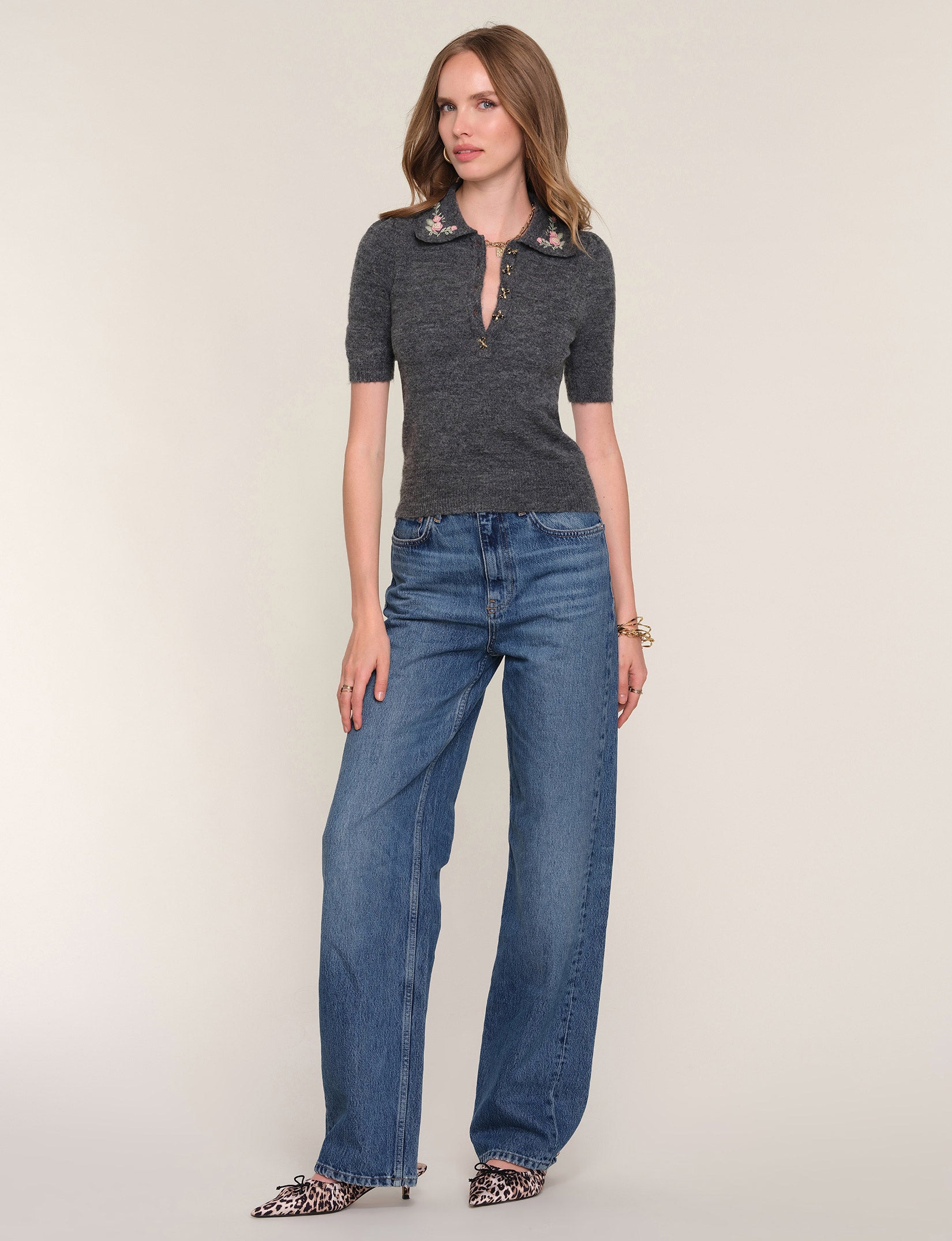 The Liza Top is a soft, polo knit. It has a slim fit and features a floral embroidery at collar tips.Content: 74% Acrylic | 22% Polyester | 4% Spandex