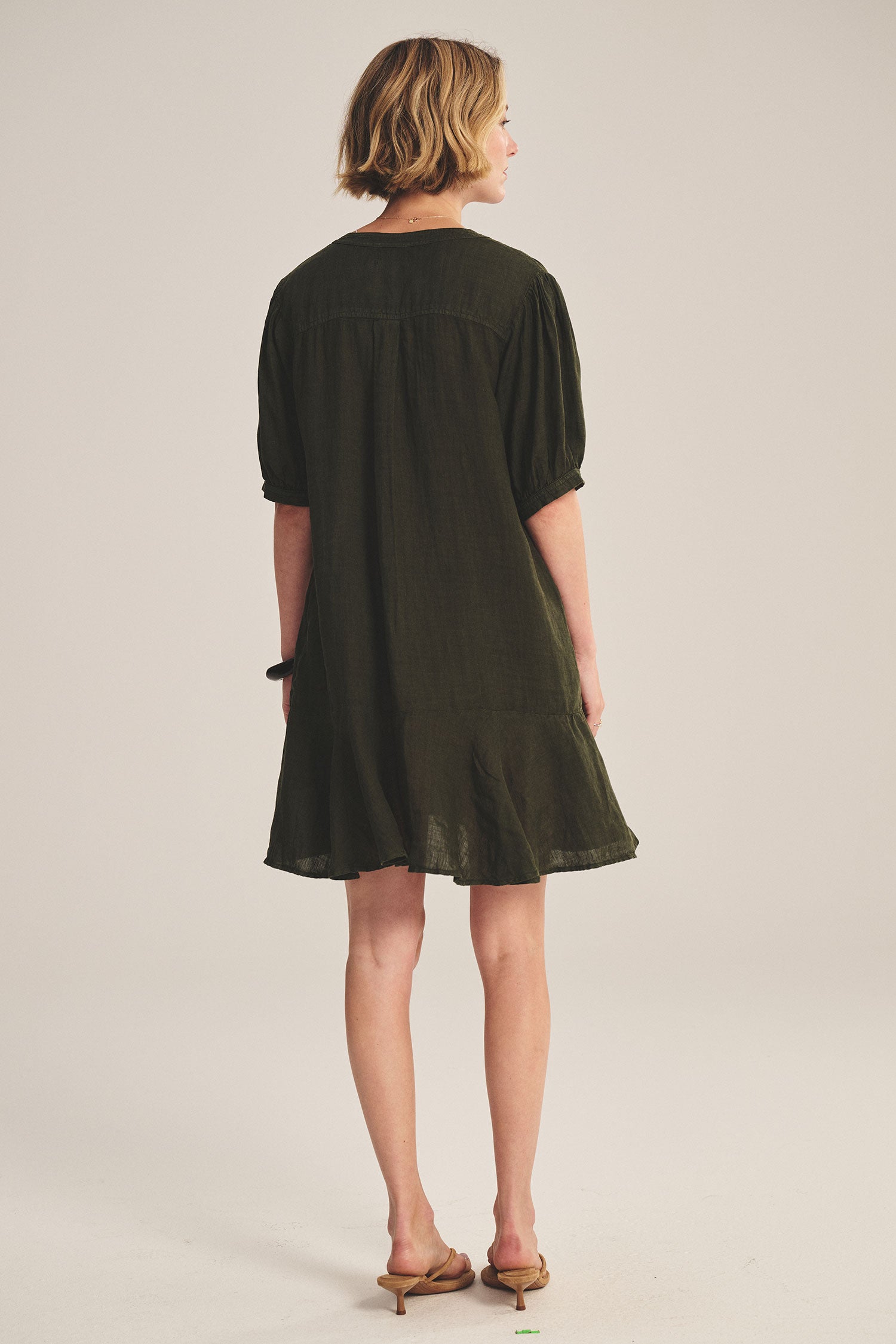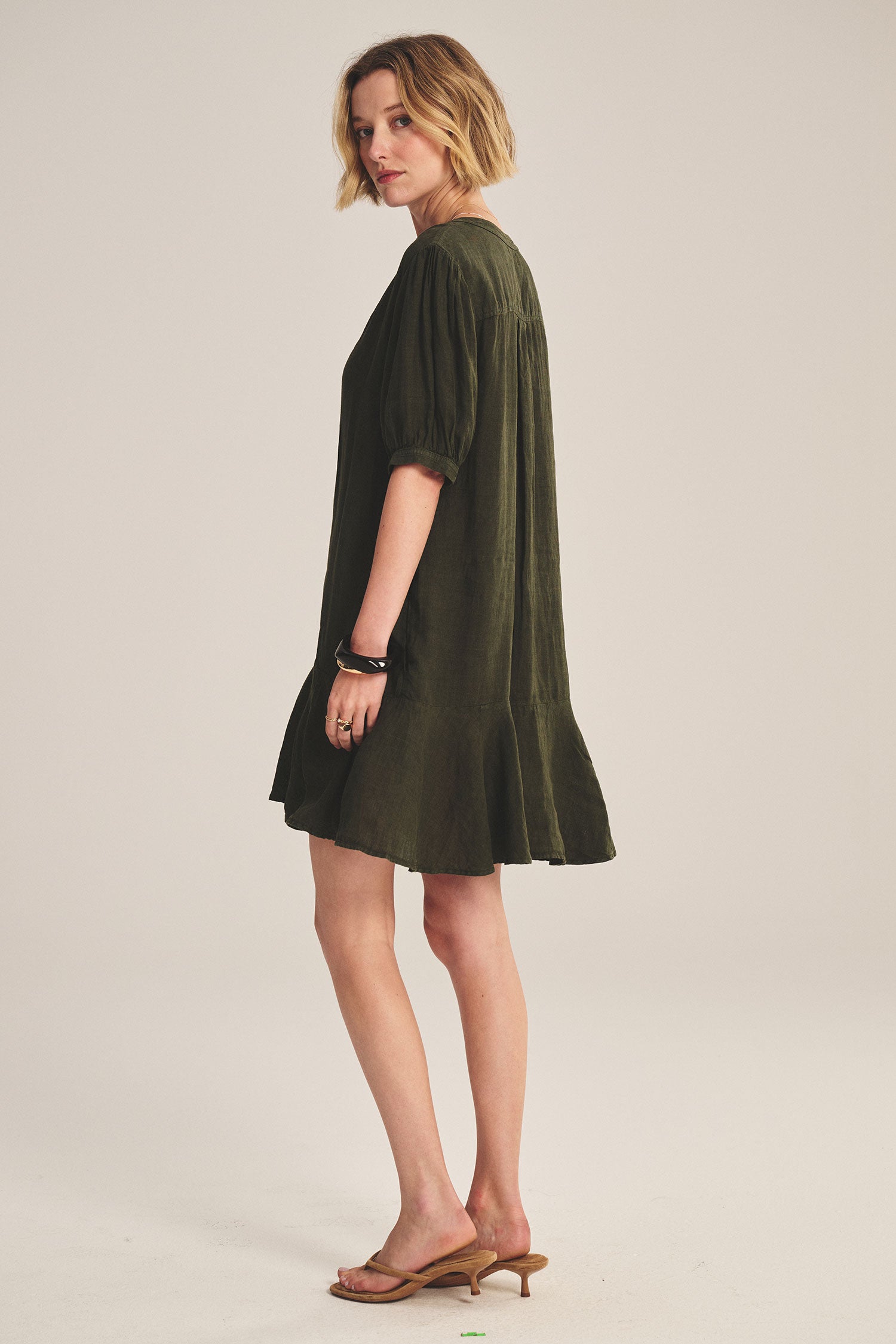 An effortlessly easy dress designed for warm days, this relaxed silhouette features a flattering V-neckline, soft elbow-length sleeves, and a subtle drop-waist ruffle that adds beautiful movement. The lightweight fabric drapes naturally, making it both breathable and comfortable while maintaining a polished look. Style it with flat sandals for everyday wear, or dress it up with heeled slides and layered gold jewelry for an elevated summer evening outfit.